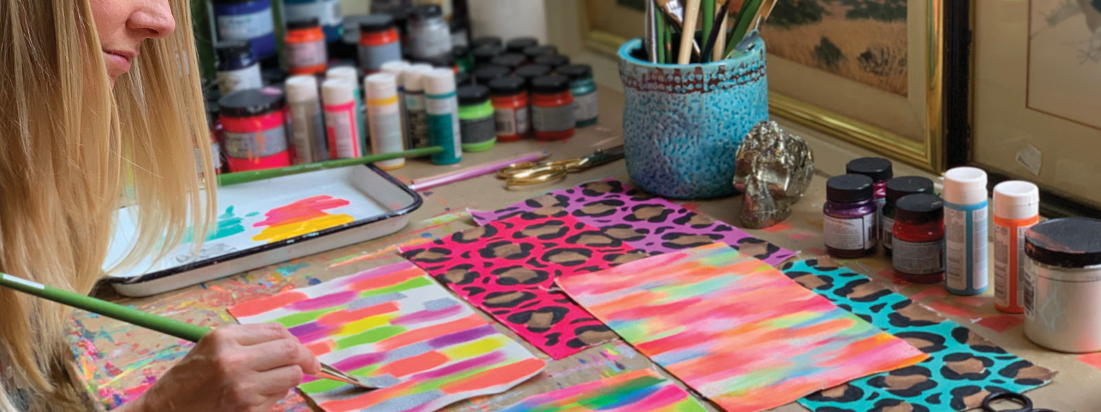 Each purse starts as a blank piece of cotton canvas which I then individually sketch + hand-paint with superior textile paints. After being heat-set, for longevity, the painting, along with carefully selected, all vegan, fabrics and hardware are given to my local sewing experts, to hand sew a finished clutch. From antiqued solid brass D-rings and silk velvet lining fabrics, to the highest quality YKK zippers, every aspect is thoughtfully designed and made to be used daily.